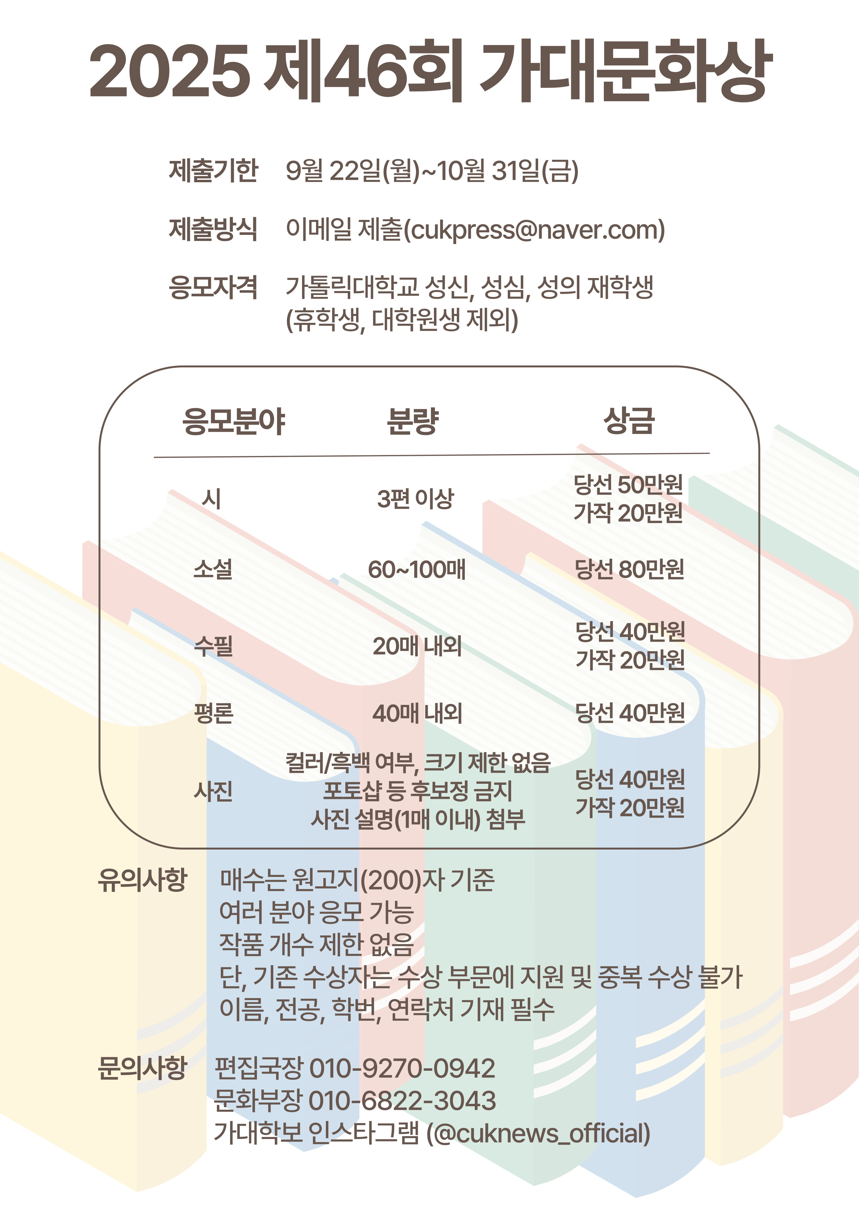 - 응모자격 : 가톨릭대학교 성신, 성심, 성의교정 재학생(휴학생, 대학원생 제외)